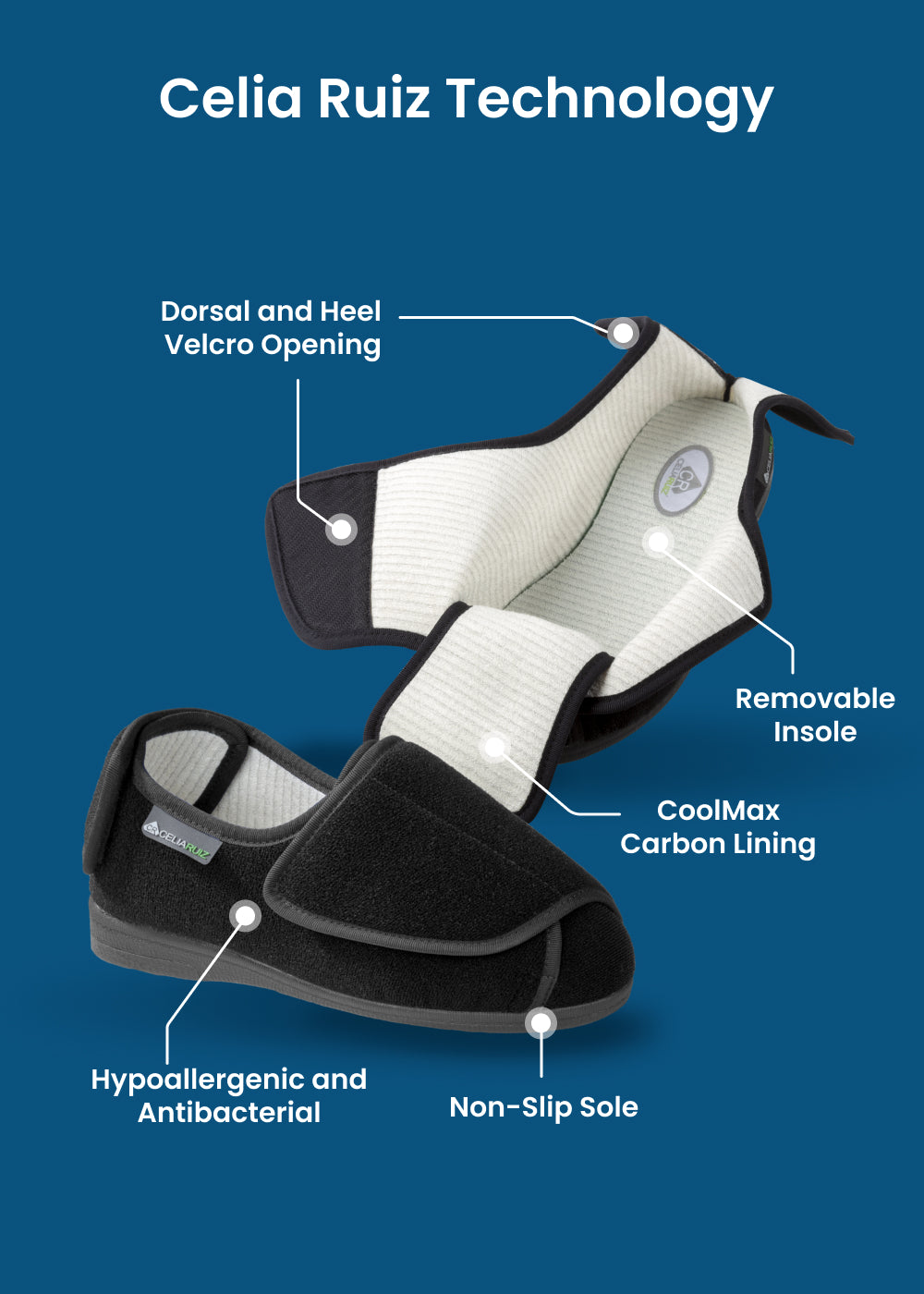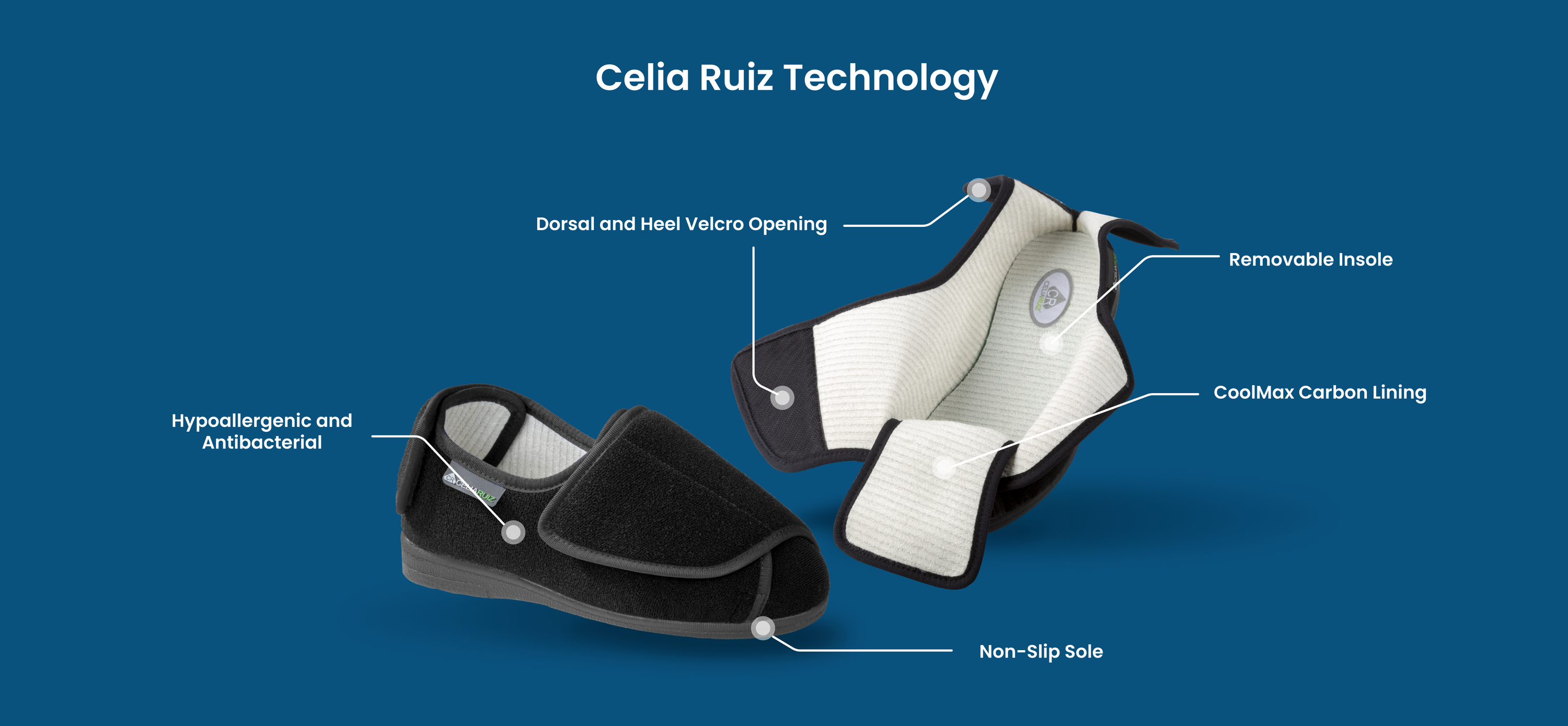 We have developed an innovative footwear collection, which combines functional footwear designs for various types of pathologies with construction materials. Combining COOLMAX® fibers with Carbon fibers gives our one of a kind shoes, the ability to create a dry, and airy environment while maintaining freshness. Celia Ruiz footwear is also fully adaptable to any size and width. The shoe opens completely to allow patient to easily enter and exit the shoe, while the unique Velcro strapping allows you to close the shoe at any width.