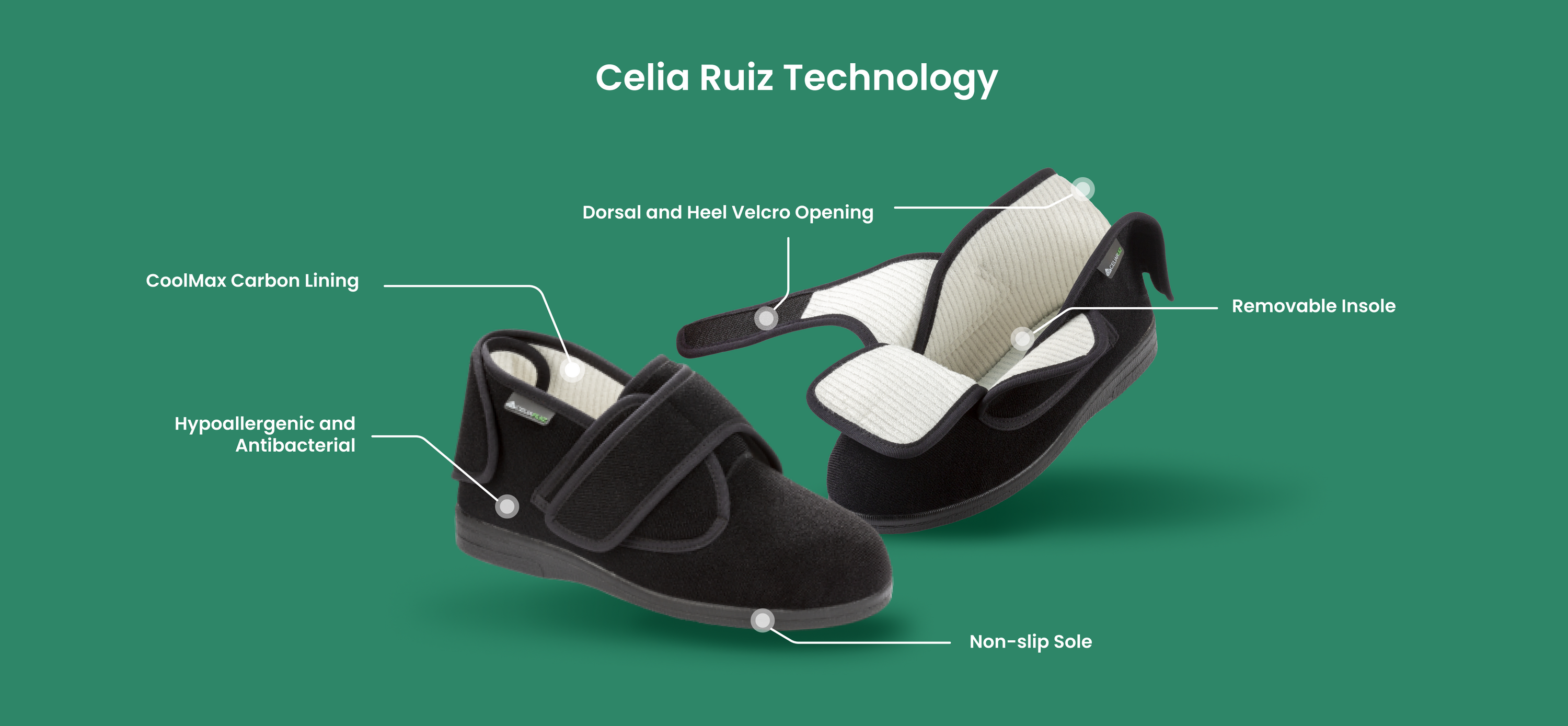 We have developed an innovative footwear collection, which combines functional footwear designs for various types of pathologies with construction materials. Combining COOLMAX® fibers with Carbon fibers gives our one of a kind shoes, the ability to create a dry, and airy environment while maintaining freshness. Celia Ruiz footwear is also fully adaptable to any size and width. The shoe opens completely to allow patient to easily enter and exit the shoe, while the unique Velcro strapping allows you to close the shoe at any width.