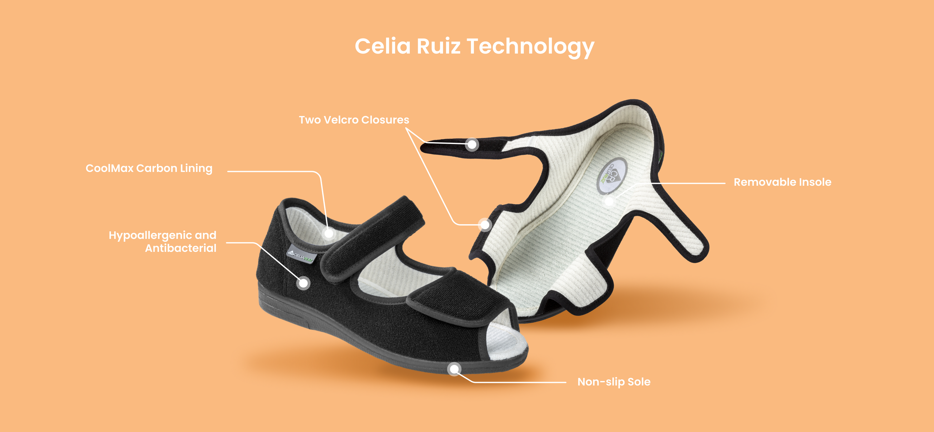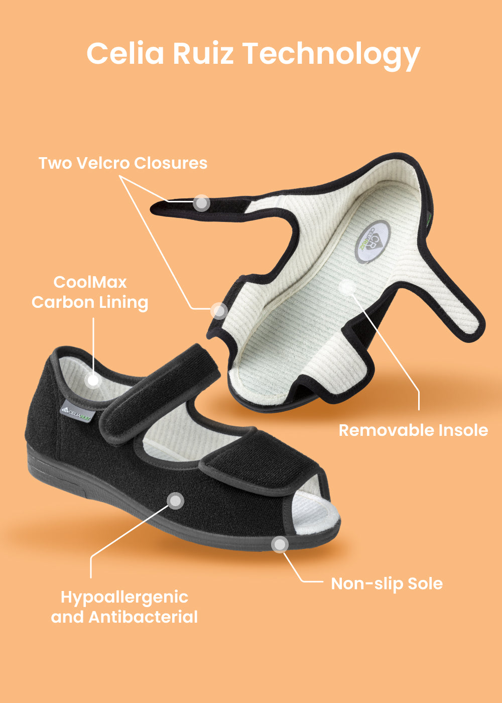 We have developed an innovative footwear collection, which combines functional footwear designs for various types of pathologies with construction materials. Combining COOLMAX® fibers with Carbon fibers gives our one of a kind shoes, the ability to create a dry, and airy environment while maintaining freshness. Celia Ruiz footwear is also fully adaptable to any size and width. The shoe opens completely to allow patient to easily enter and exit the shoe, while the unique Velcro strapping allows you to close the shoe at any width.