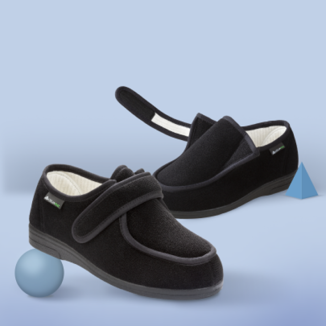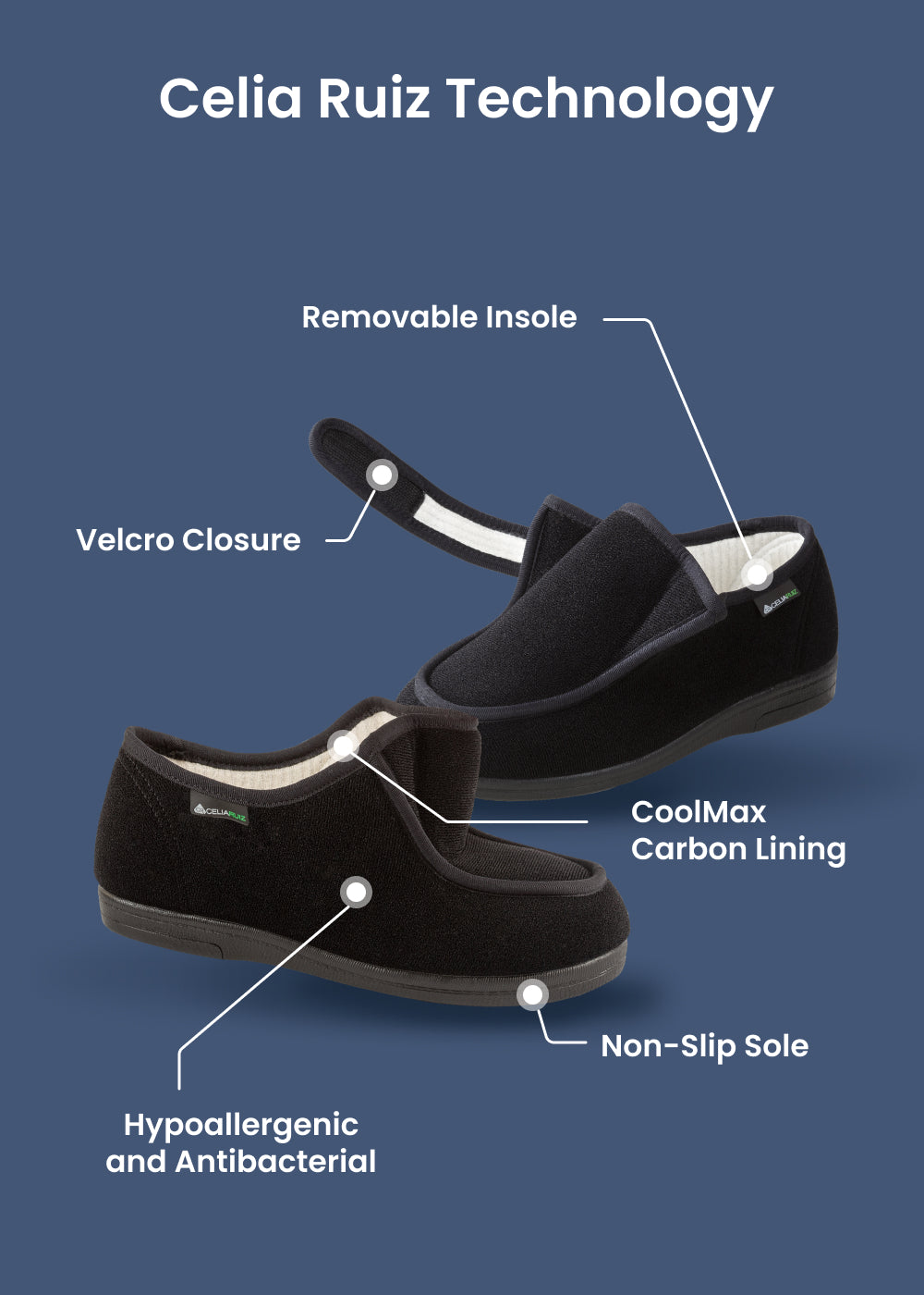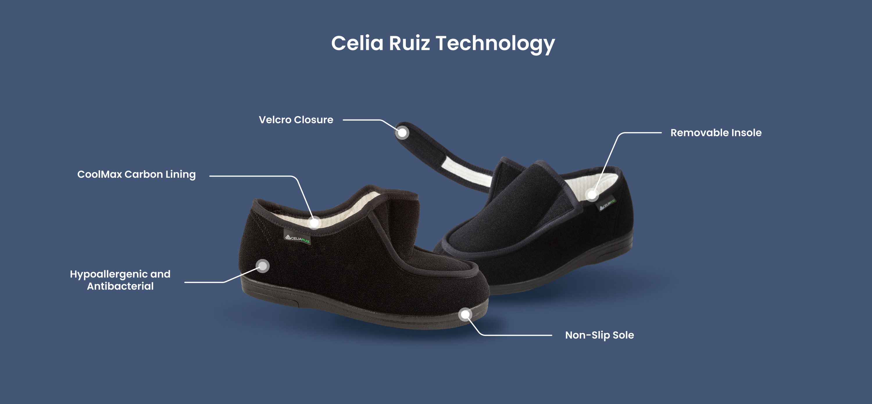 We have developed an innovative footwear collection, which combines functional footwear designs for various types of pathologies with construction materials. Combining COOLMAX® fibers with Carbon fibers gives our one of a kind shoes, the ability to create a dry, and airy environment while maintaining freshness. Celia Ruiz footwear is also fully adaptable to any size and width. The shoe opens completely to allow patient to easily enter and exit the shoe, while the unique Velcro strapping allows you to close the shoe at any width.